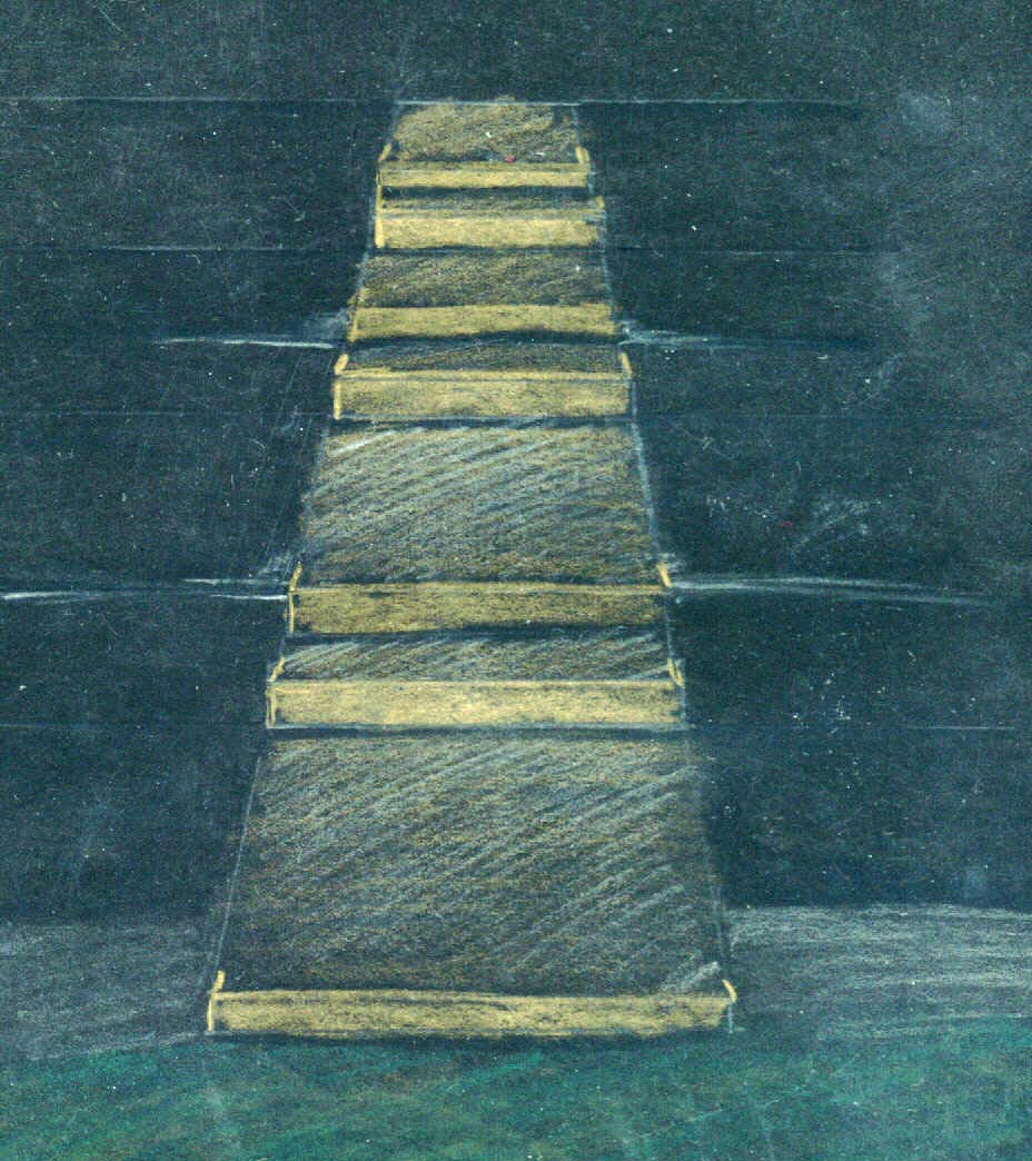 | Hope spent the majority of the piece climbing and falling down this staircase Sisphysus-style. | |